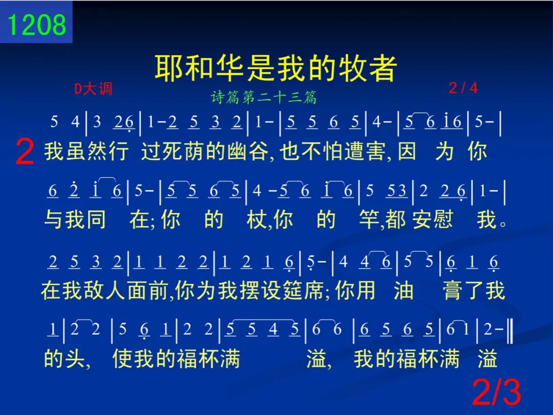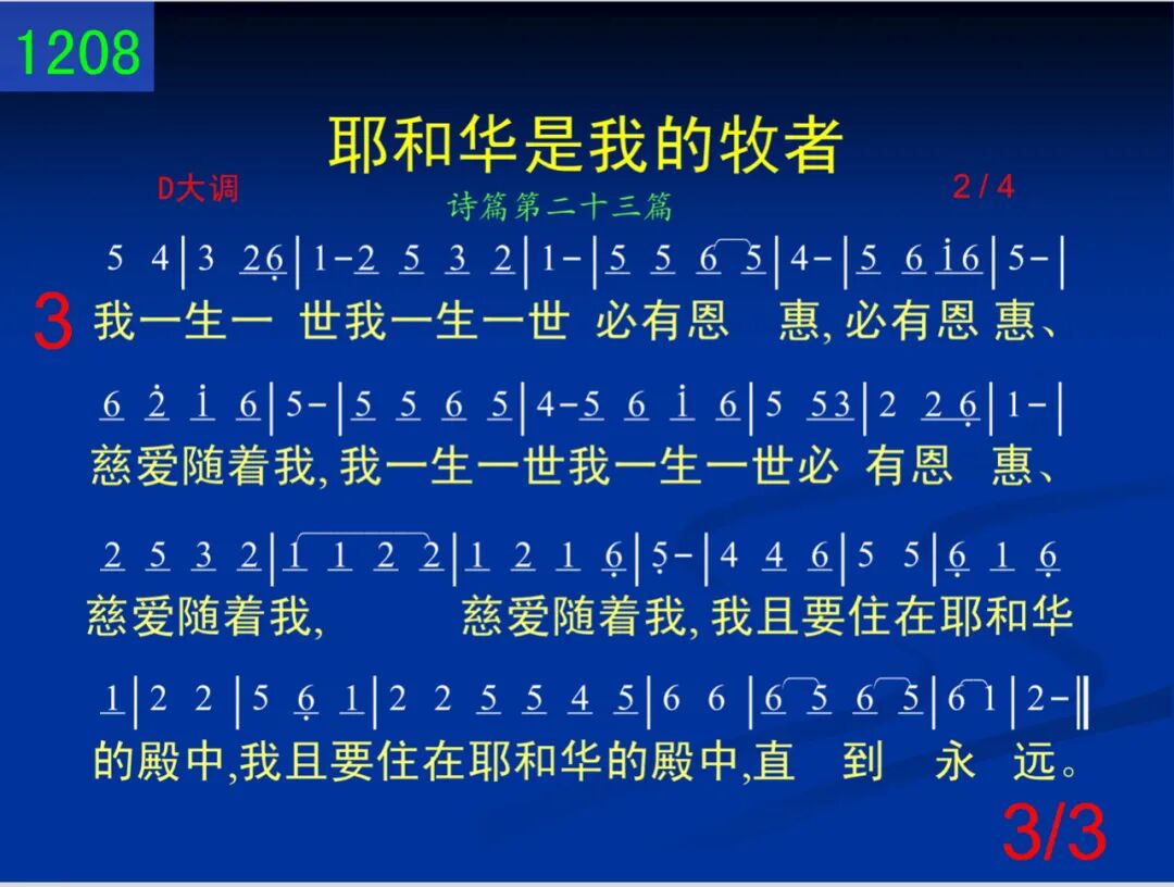 耶和华是我的牧者,我必不至缺乏,祂使我躺卧在青草地上,领我在可安歇的水边;祂使我的灵魂苏醒,为自己的名引导我走义路,为自己的名引导我走义路,引导我走义路。 二 我虽然行过死荫的幽谷,也不怕遭害,因为你与我同在,你的杖,你的竿都安慰我;在我敌人面前,你为我摆设筵席,你用油膏了我的头,使我的福杯满溢,我的福杯满溢。 三 我一生一世,我一生一世,必有恩惠,必有恩惠、慈爱随着我,我一生一世,我一生一世,必有恩惠、慈爱随着我,慈爱随着我,我且要住在耶和华的殿中,我且要住在耶和华的殿中,直到永远。